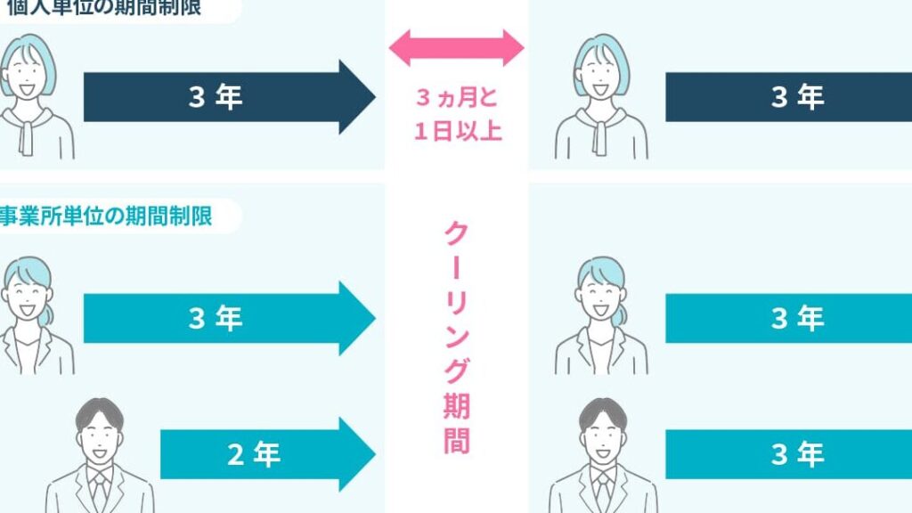 クーリング期間は、主に派遣先での勤務が3年を超える場合に必要です。この期間中は、同じ職場での再雇用が禁止されます。定義としては、派遣社員が特定の派遣先での雇用を終了した場合、その後、少なくとも6か月間はその派遣先で働くことができないことを言います。このルールは、派遣社員が新しい職場での経験を積む機会を提供するために導入されています。