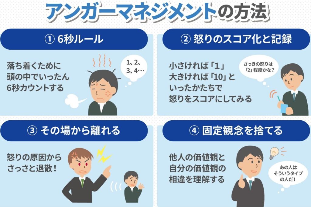 具体的な方法として「アンガー マネジメント 6 秒 ルール」を活用することが推奨されます。このルールは、感情を冷静に観察し、反応する前に6秒待つことを提案しています。この単純な行動が、反応をコントロールし、思考を整理する助けになります。