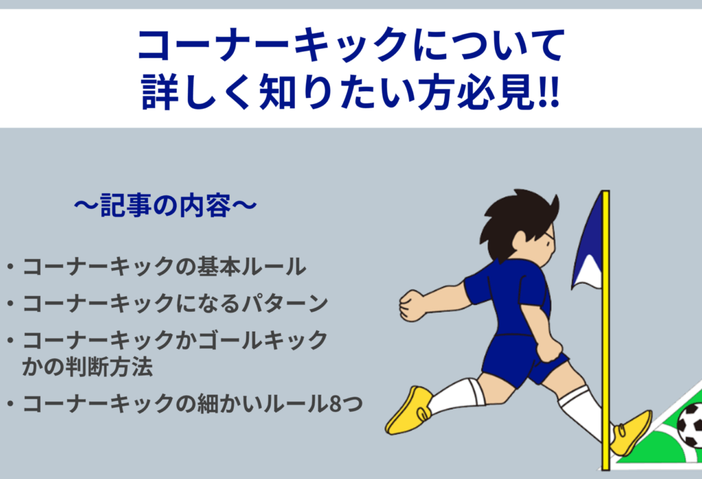 コーナーキックは試合の戦略的な鍵を握る重要なプレーです。コーナーキックのルールを理解することが、得点機会を最大限に引き出すために必要です。