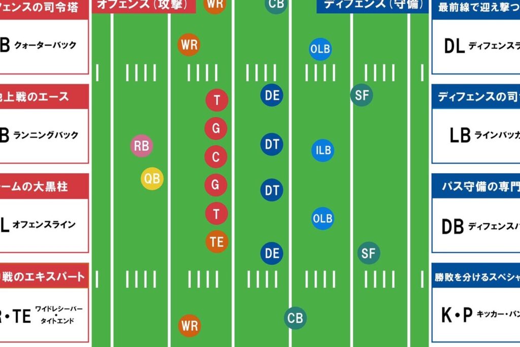 各試合には2つのチーム、すなわち攻撃チームと防御チームがあります。各チームには11人の選手がいて、それぞれ特定のポジションに分かれています。主なポジションには次のようなものがあります。