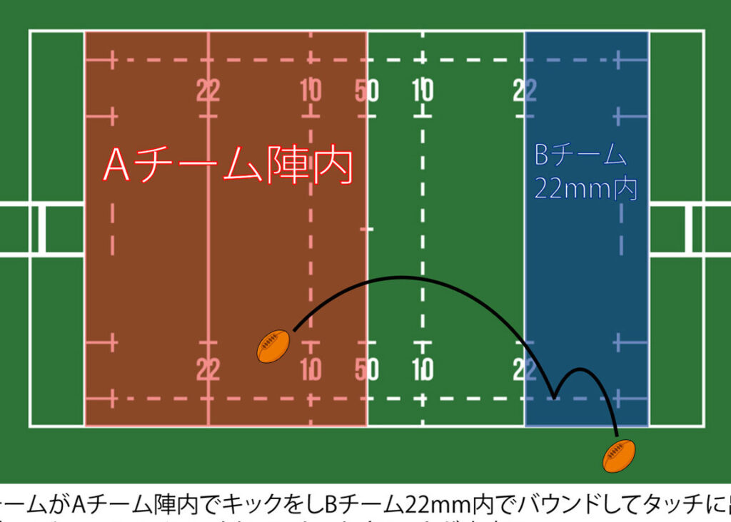 - ボールキックの方法: 自陣22メートル内からキックすることなく、敵陣の22メートルラインを越えるキックが可能です。